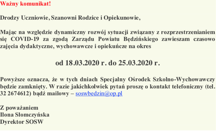 Szanowni Państwo, W związku z rozprzestrzenianiem się koronawirusa i ogłoszonym stanem zagrożenia epidemiologicznego oraz w trosce o zdrowie i bezpieczeństwo uczniów i wychowanków Specjalnego Ośrodka Szkolno-Wychowawczego w Będzinie bardzo proszę, aby podopieczni ośrodka spędzali ten czas w domu, to nie jest czas wolny, to czas kwarantanny. Bardzo proszę jeżeli to jest możliwe, aby w poniedziałek, tj. 16 marca 2020 r. uczniowie pozostali w domu. O wszelkich zmianach będą Państwo informowani na bieżąco. W sytuacji wymagającej pozyskania informacji bądź wsparcia ze strony SOSW proszę o kontakt telefoniczny 32 267 46 12 (od poniedziałku od godz.7.00) bądź mail – soswbedzin@op.pl. Równocześnie zobowiązuję Rodziców do stosowania się do zaleceń zamieszczonych na stronie Głównego Inspektora Sanitarnego i Ministerstwa Zdrowia dotyczących zagrożenia epidemiologicznego koronawirusem oraz o bezzwłoczne przekazywanie informacji o zachorowaniach, które dotyczą osób ze środowiska SOSW. Z poważaniem Ilona Słomczyńska Dyrektor SOSW w Będzinie