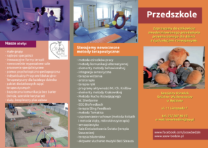 – możliwość korzystania z terapii SI, zajęć logopedycznych, terapii widzenia, terapii EEG Biofeedback, Tomatisa, terapii W. Sherborne, muzykoterapii, terapii ręki, terapii Snoezelen, terapii behawioralnej, Programu Aktywności Knillów, Treningu umiejętności społecznych, metody symulatniczo-sekewncyjnej.